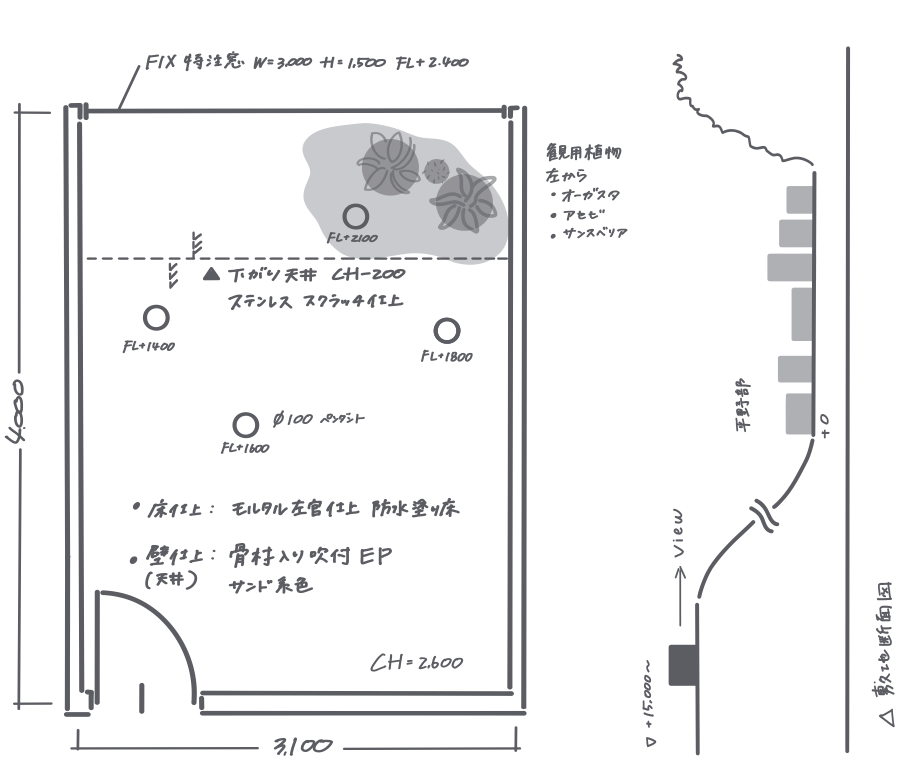 黄昏の時間、ライトを灯し、窓からまちなみを眺めています。植物たちには水やりをしましたが、受け皿を忘れてしまい水浸しになってしまっています。ライトの光は天井の鏡面と床の水にうつりこんでいます。