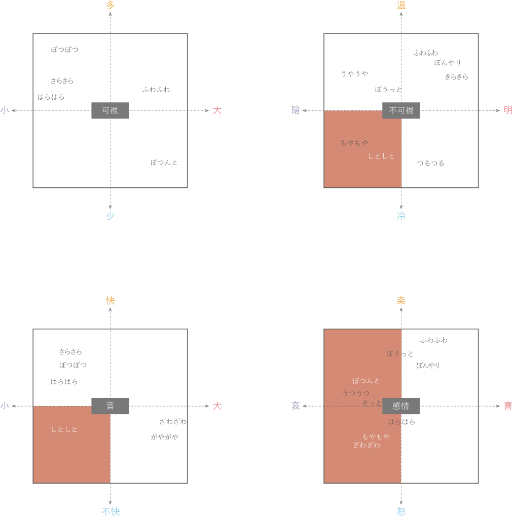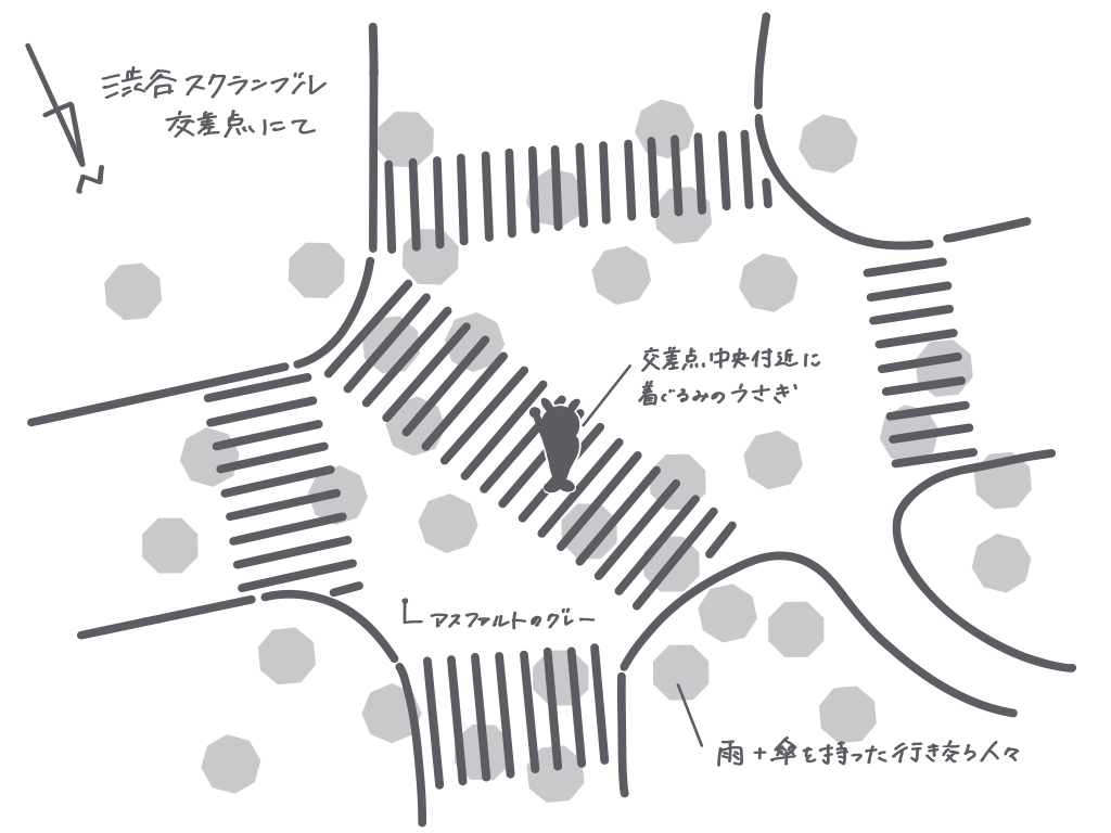 雨がぽつぽつと降る中、交差点の真ん中のあたりに着ぐるみのうさぎがひとりで立っています。多くの人が行き交い、傘が重なり合っています。